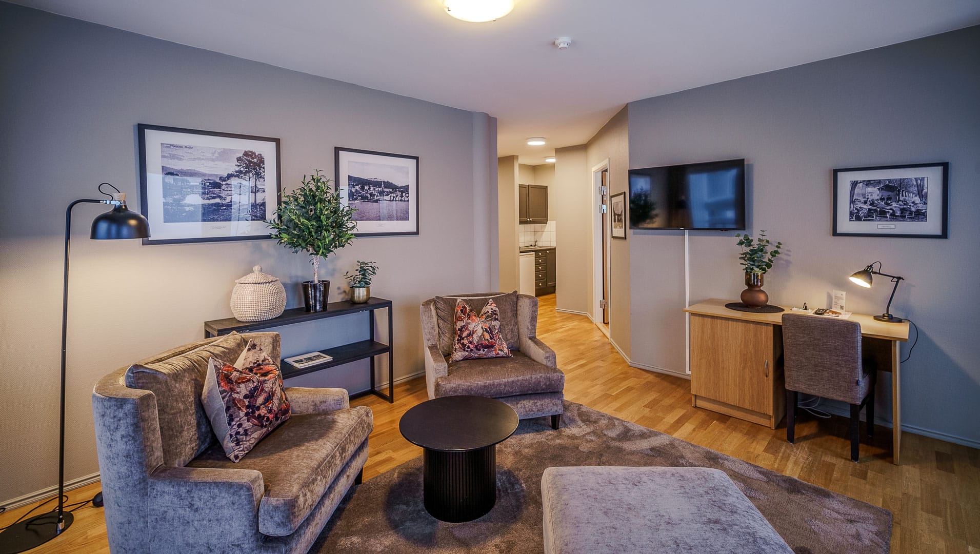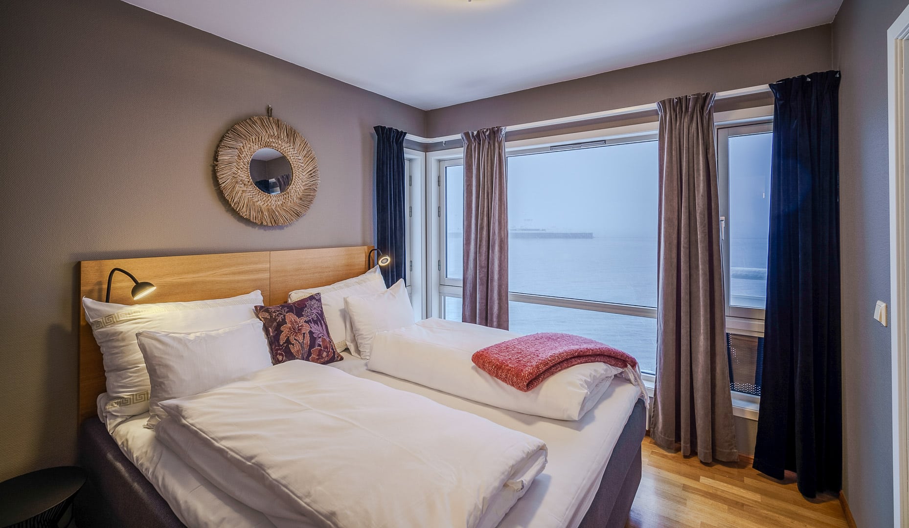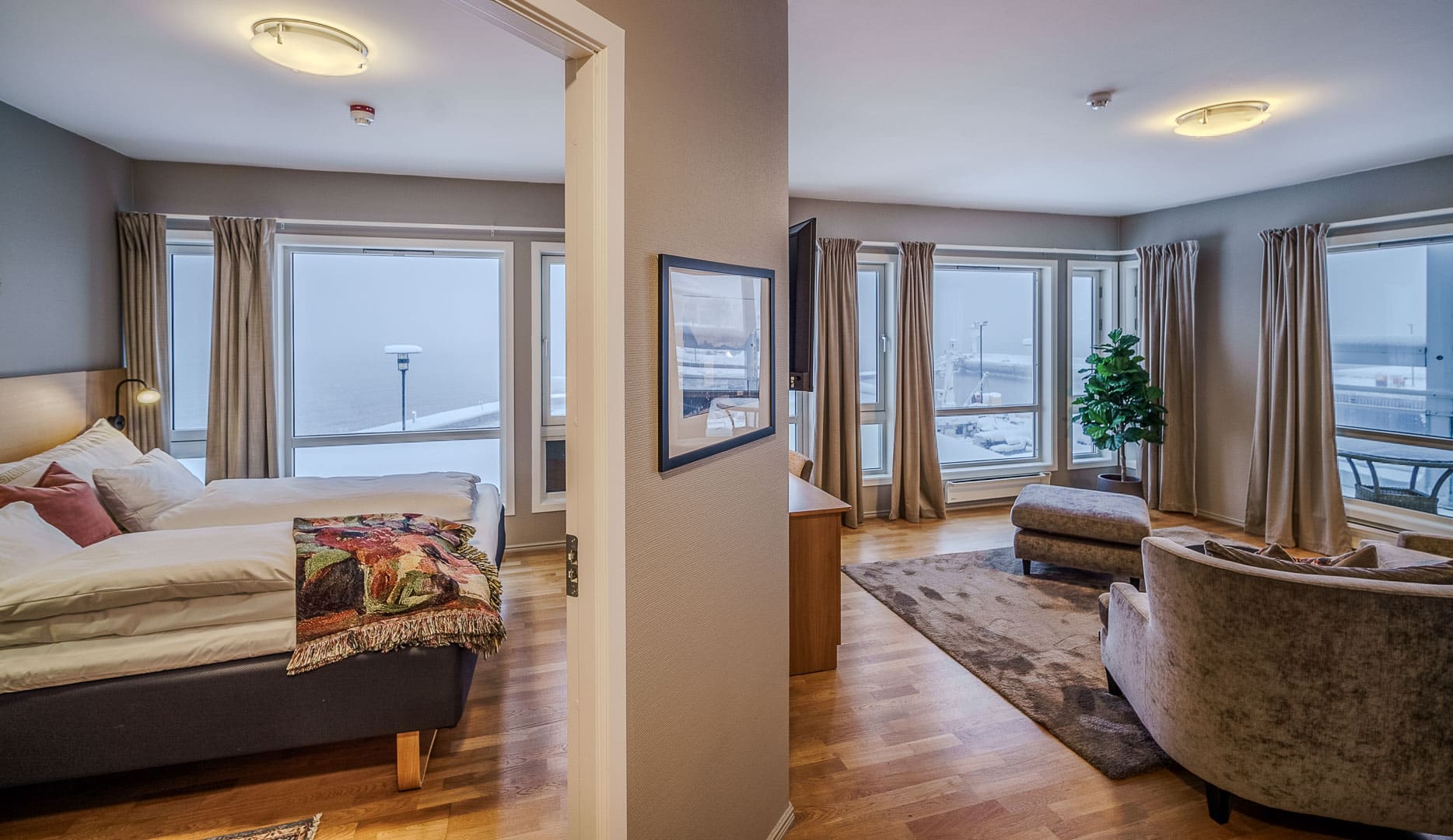 Her får du god plass og ekstra komfort, med to private balkonger som slipper fjorden og Moldes vakre fjell inn i rommet. Junior suitene er lyse, romslige og har eget soverom med dobbeltseng, norskprodusert kvalitetsmadrass og myk dundyne. Her kan du slappe av i stilfulle omgivelser, nyte utsikten eller starte dagen med en kopp kaffe. Badet har dusj, og suiten har både skrivebord, flatskjerm-TV og gratis wifi. Frokost er inkludert, og rommet passer for to personer som ønsker litt ekstra.