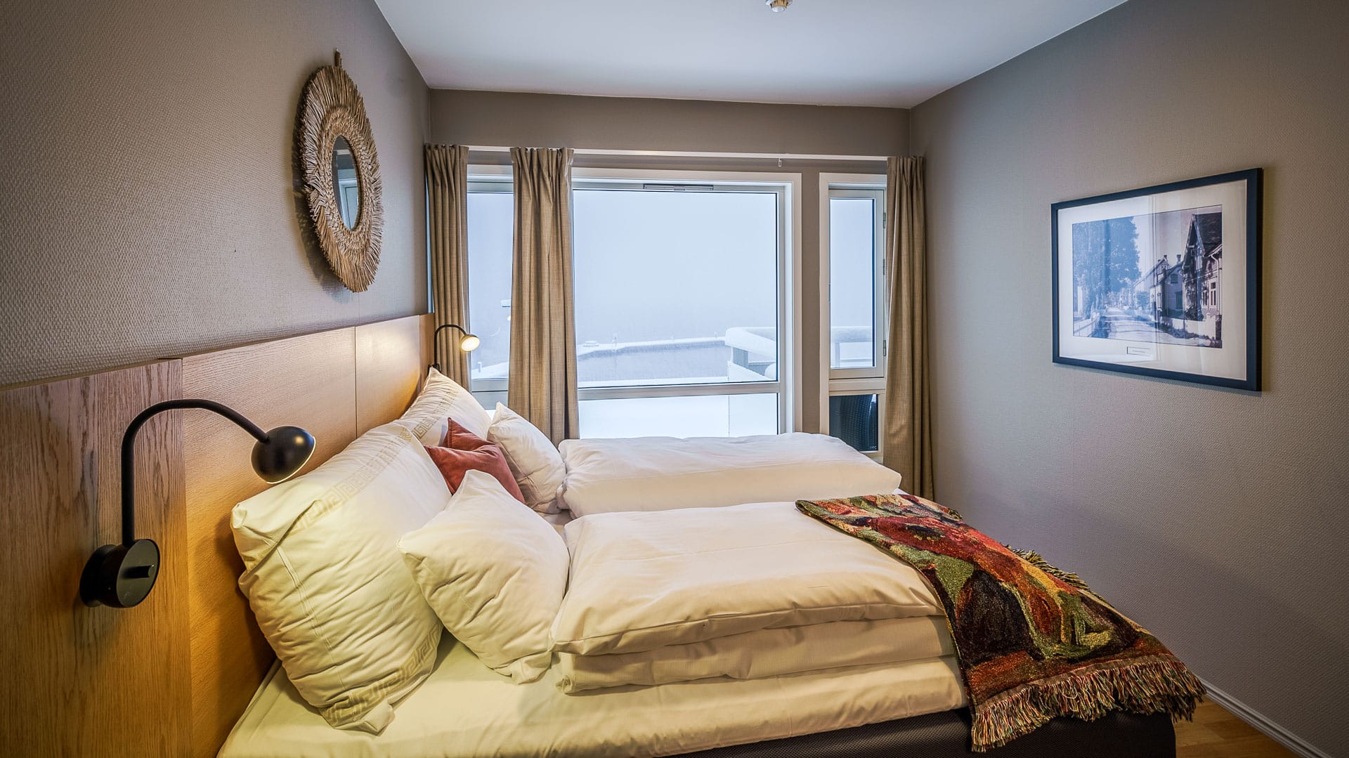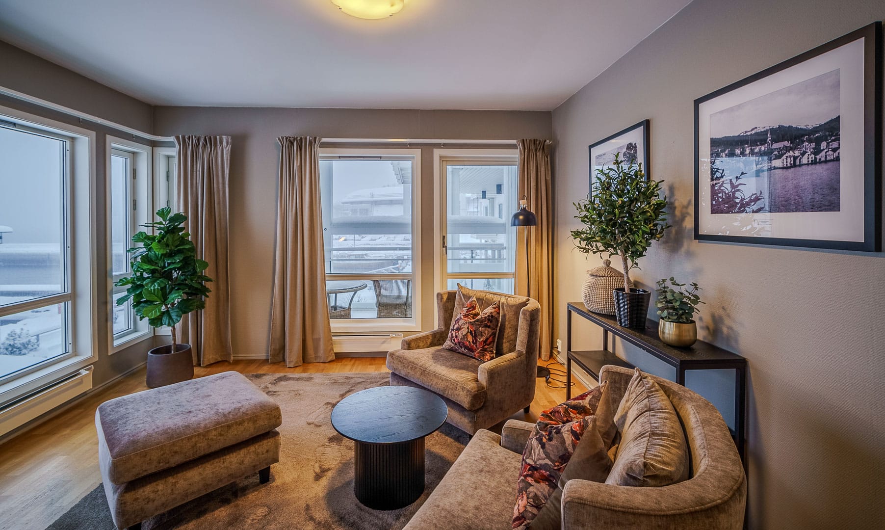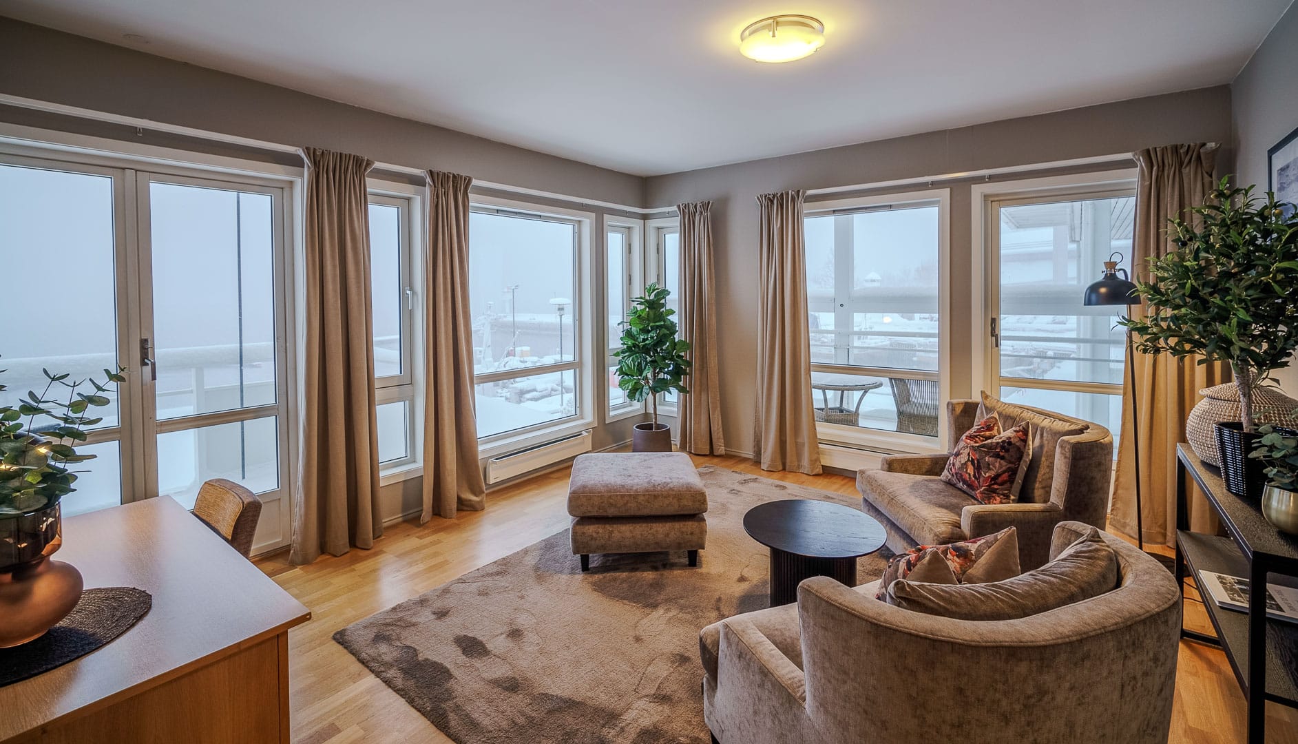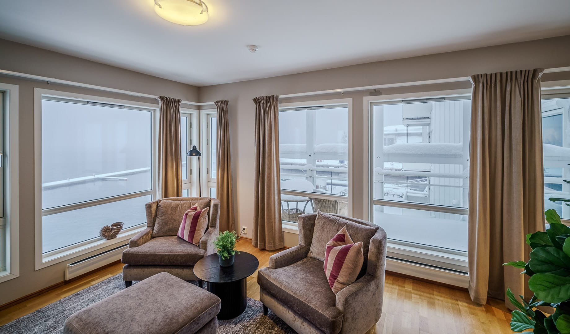 Her får du god plass og ekstra komfort, med to private balkonger som slipper fjorden og Moldes vakre fjell inn i rommet. Junior suitene er lyse, romslige og har eget soverom med dobbeltseng, norskprodusert kvalitetsmadrass og myk dundyne. Her kan du slappe av i stilfulle omgivelser, nyte utsikten eller starte dagen med en kopp kaffe. Badet har dusj, og suiten har både skrivebord, flatskjerm-TV og gratis wifi. Frokost er inkludert, og rommet passer for to personer som ønsker litt ekstra.